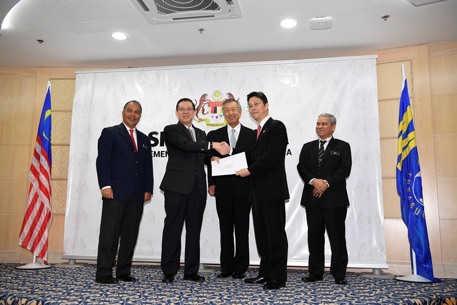 YB Menteri Kewangan, Tuan Lim Guan Eng telah menyerahkan Surat Pelantikan Rasmi Bank Pengatur Utama Bagi Penerbitan Bon kepada Mizuho Bank (Malaysia) Berhad, HSBC Bank Malaysia Berhad & Daiwa Markets Singapore Limited dengan kerjasama Affin Hwang Investment Bank di Kompleks Kementerian Kewangan Malaysia.