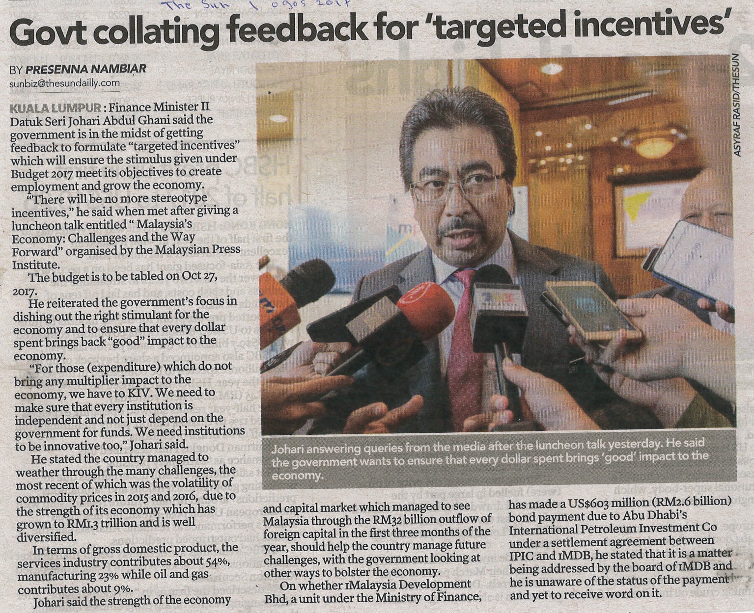 Malay Mail - Johari : Malaysia To Sustain Strong GDP Growth Over 2H17 |