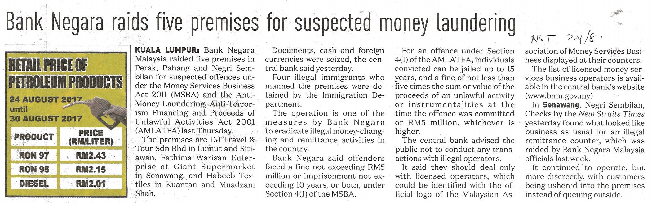 The New Strait Times - Bank Negara Raids Five Premises For Suspected Money Laundering |