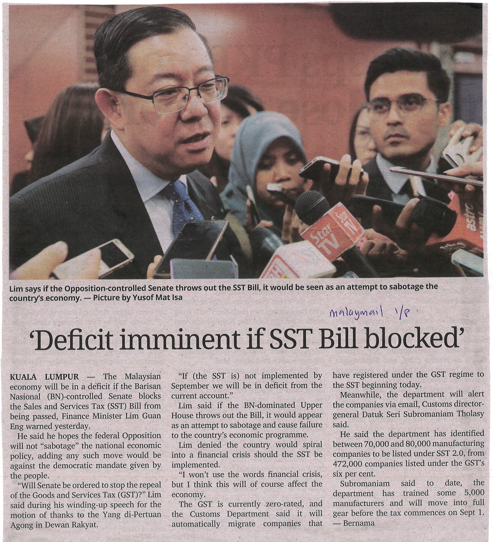 Malay Mail - Deficit Imminent If SST Bill Blocked |