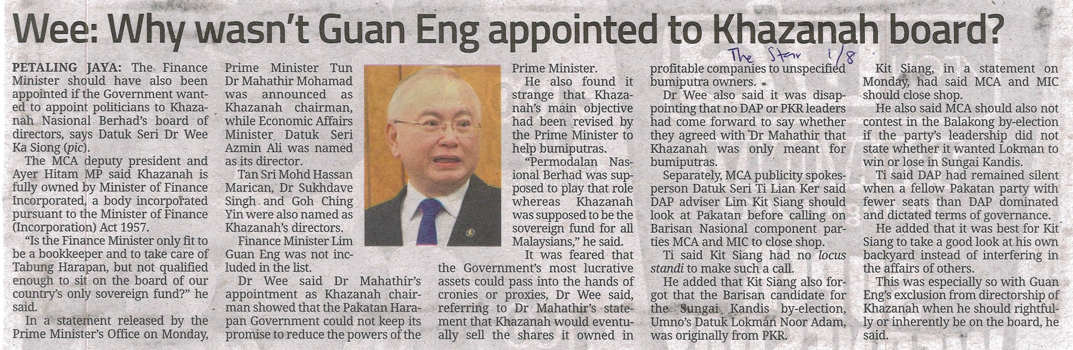 The Star - Wee: Why Wasn't Guan Eng Appointed To Khazanah Board? |