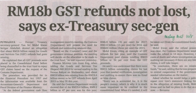 Malay Mail - RM18b GST Refunds Not Lost, Says Ex-Treasury Sec-Gen |