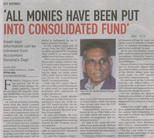 New Straits Times - All Monies Have Been Put Into Consolidated Fund |