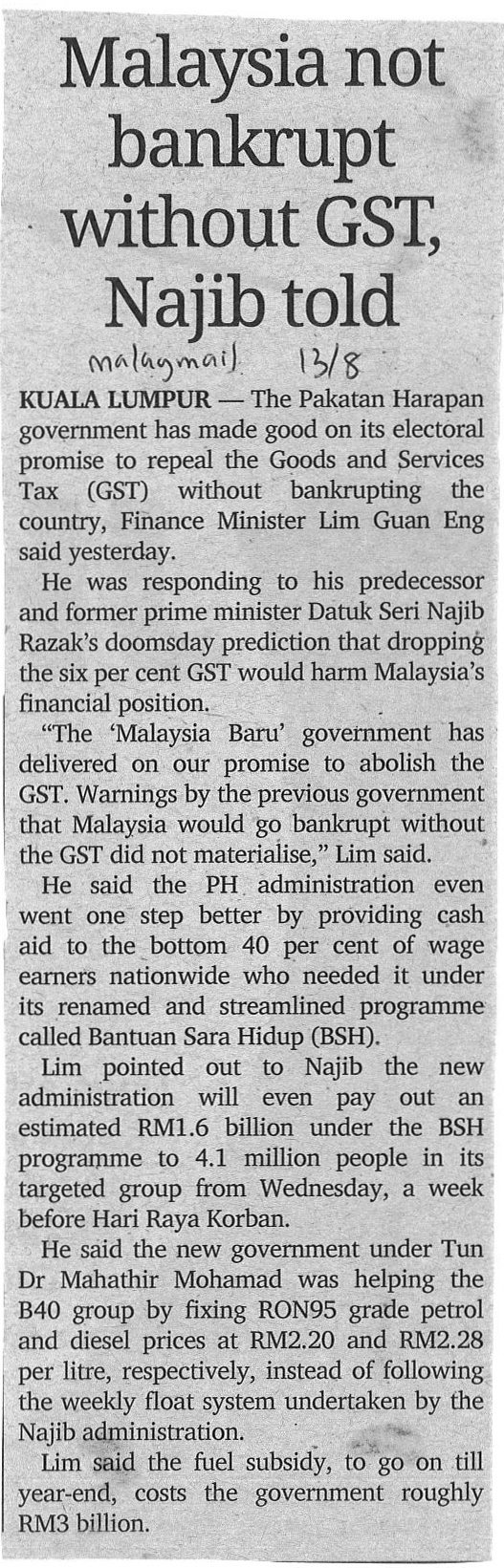 Malay Mail - Malaysia Not Bankrupt, Without GST, Najib Told |