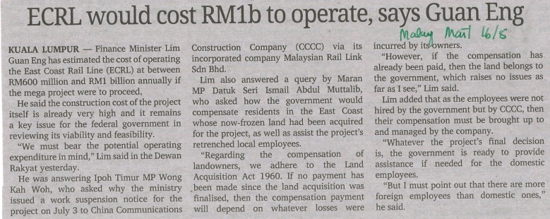 Malay Mail - ECRL Would Cost RM1b To Operate, Says Guan Eng |