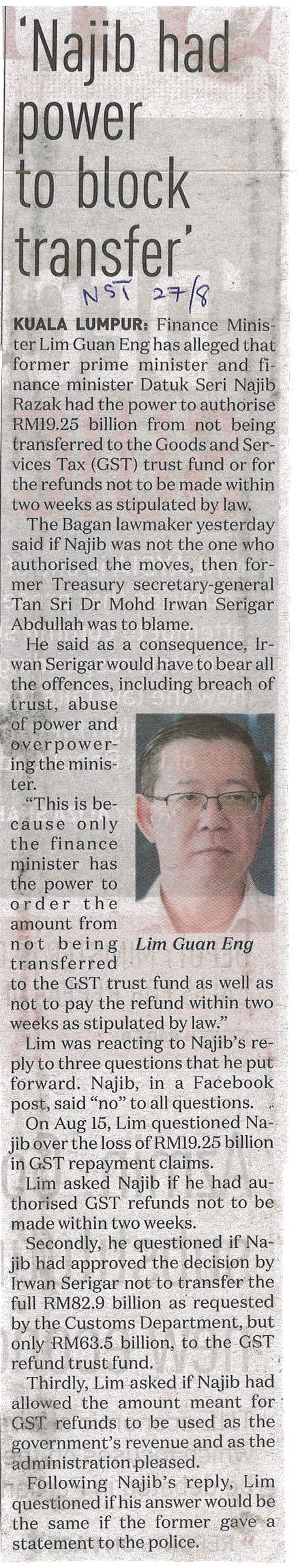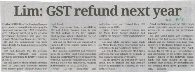 New Straits Times - Lim: GST Refund Next Year |