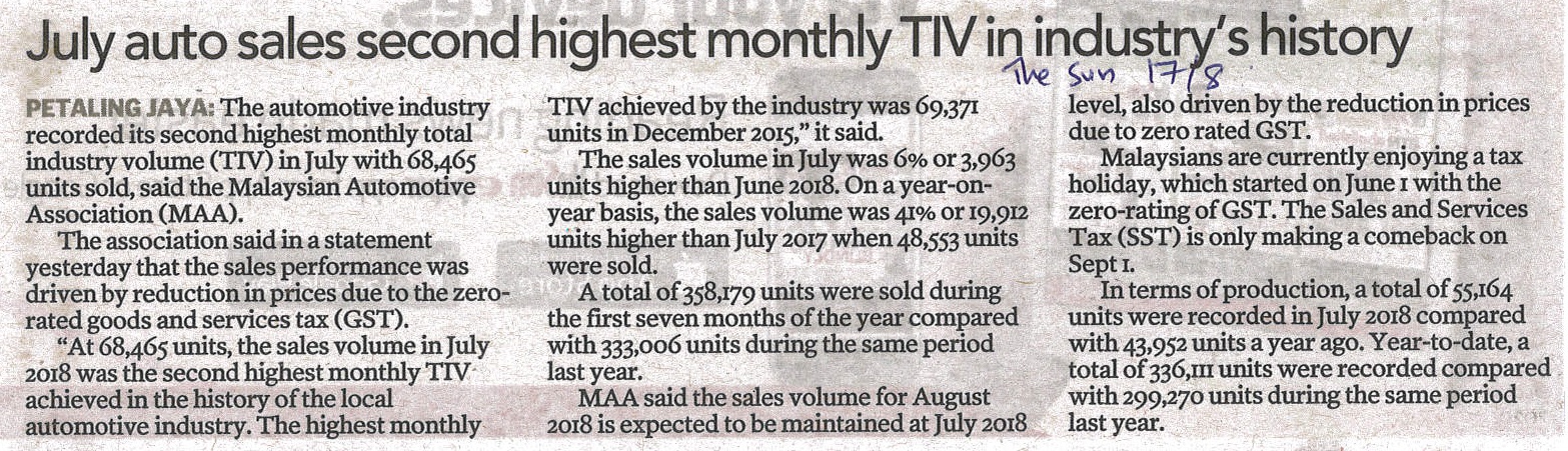 The Sun - July Auto Sales Second Highest Monthly TIV In Industry's History |