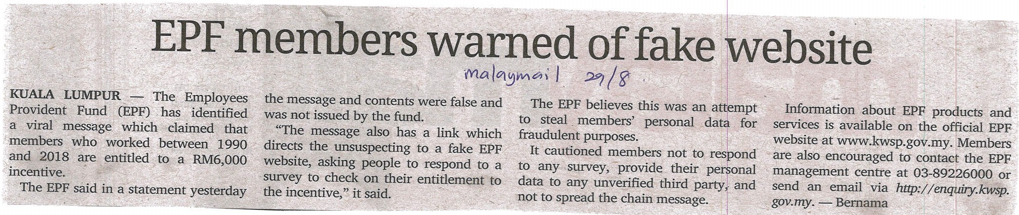 Malay Mail - EPF Members Warned Of Fake Website