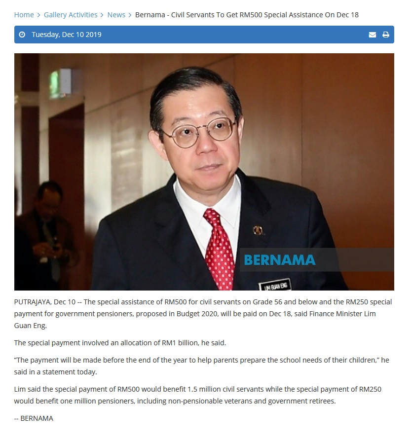 Bernama - Civil Servants To Get RM500 Special Assistance On Dec 18 |