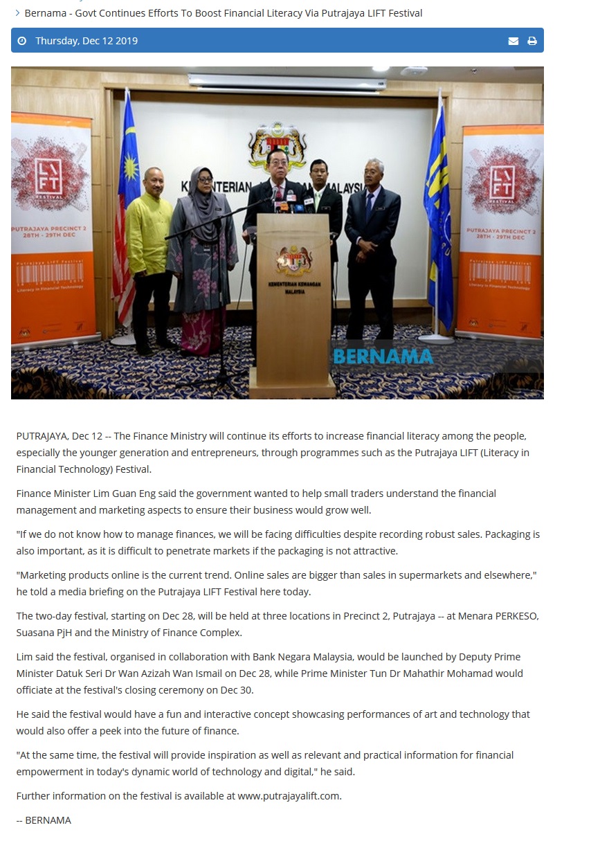 Bernama - Govt Continues Efforts To Boost Financial Literacy Via Putrajaya LIFT Festival |
