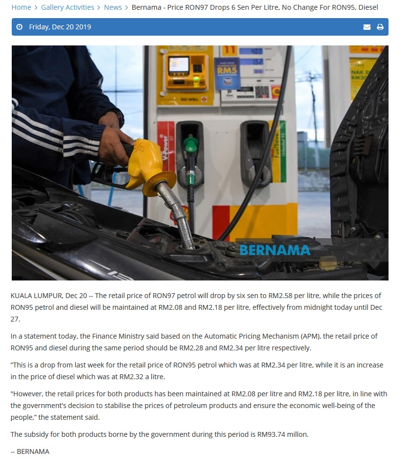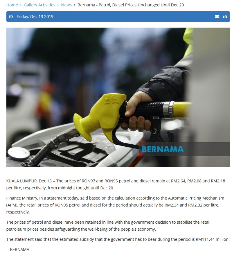 Bernama - Petrol, Diesel Prices Unchanged Until Dec 20 |