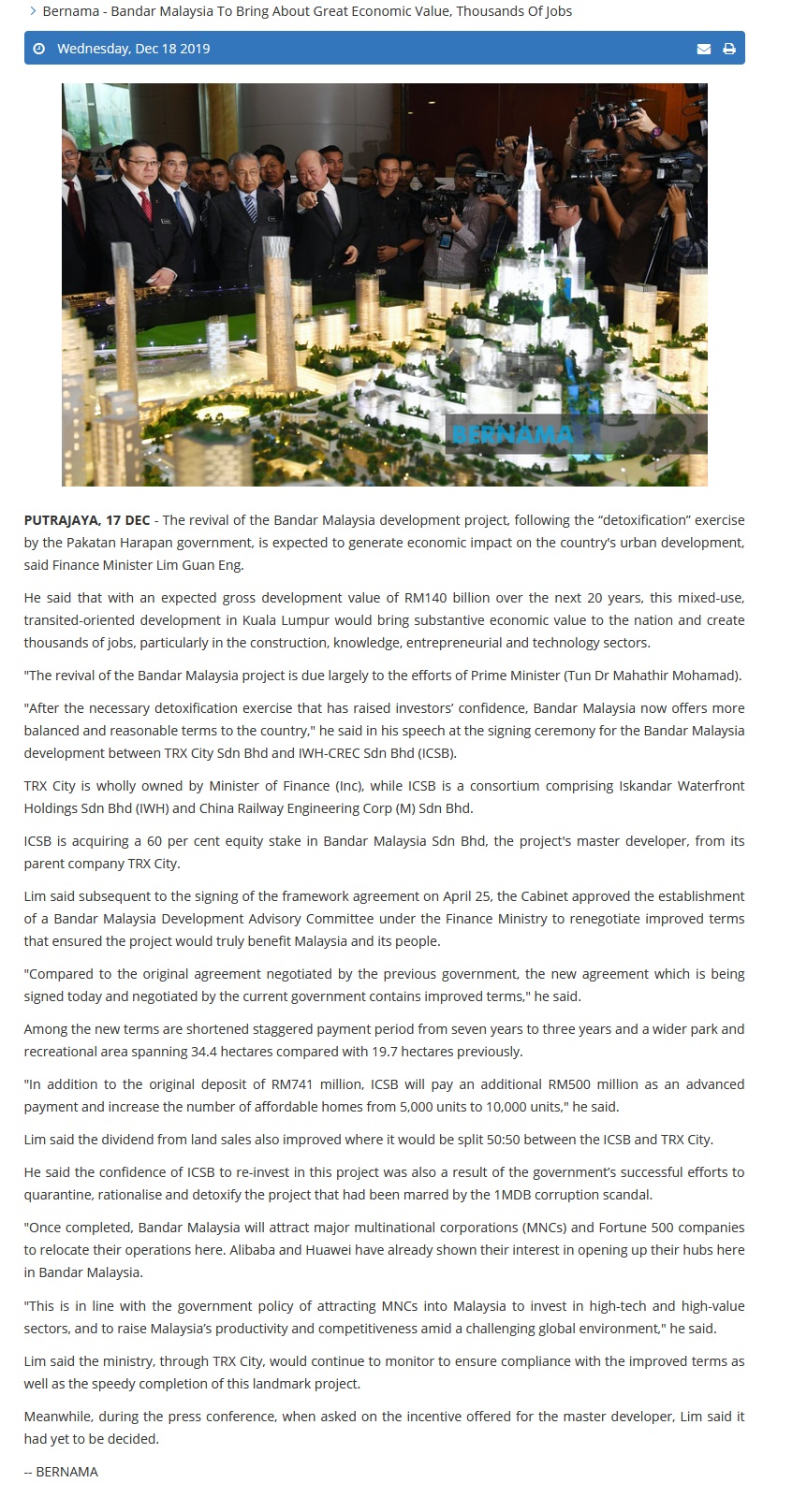 Bernama - Bandar Malaysia To Bring About Great Economic Value, Thousands Of Jobs |