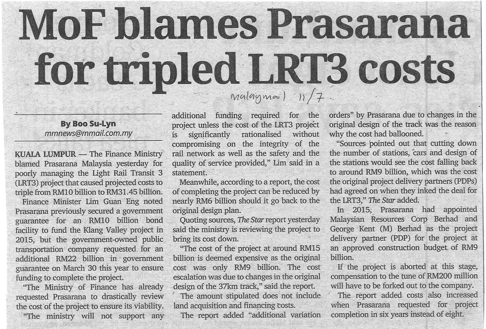 Malay Mail - MoF Blames Prasarana For Triped LRT3 Costs |