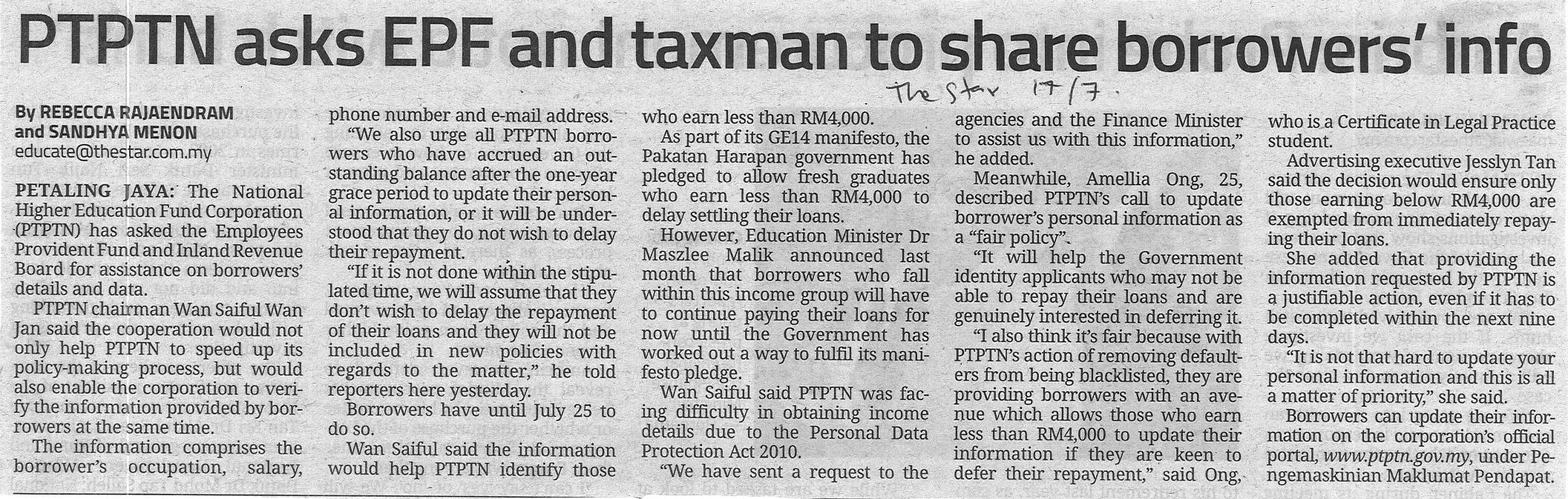 The Star - PTPTN Asks EPF And Taxman To Share Borrowers' Info |