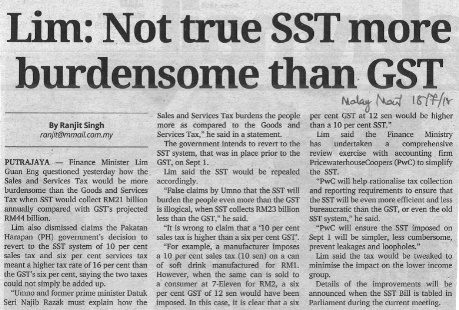 Malay Mail - Lim :Not True SST More Burdensome Than GST |
