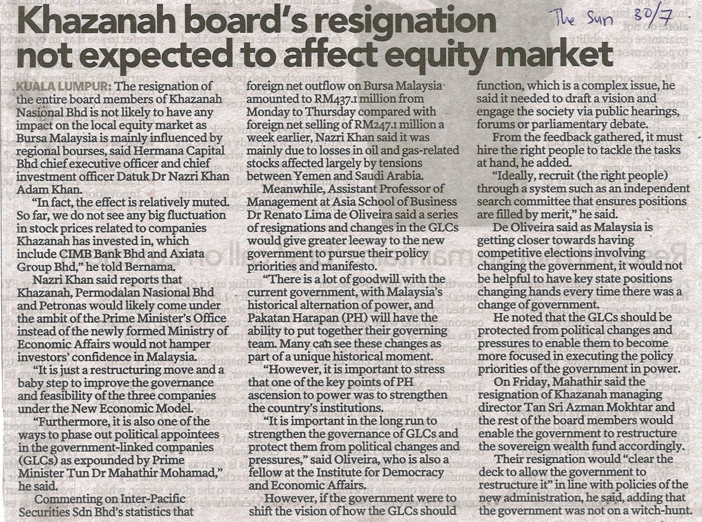 The Sun - Khazanah Board's Resignation Not Expected To Effect Equity Market