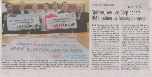 New Strait Times - Spritzer, Yee Lee Corp Donate RM1 Milion To Tabung Harapan |