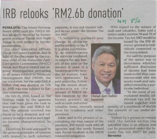 New Strait Times - IRB Relook 'RM2.6b Donation' |