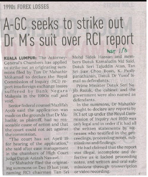 New Straits Times - A-GC Seeks To Strike Out Dr M's Suit Over RCI Report |