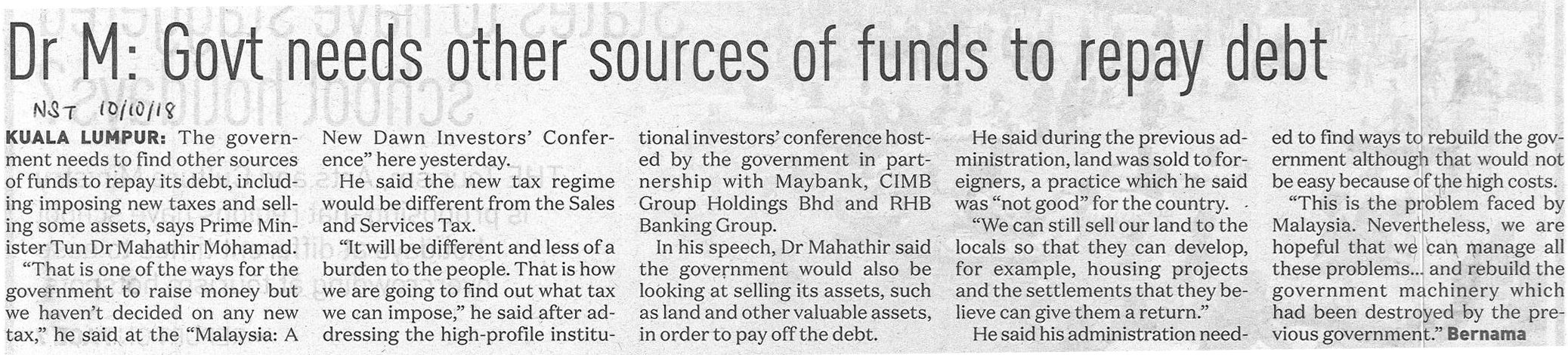 New Straits Times - Dr M: Govt Needs Other Sources Of Funds To Repay Debt |