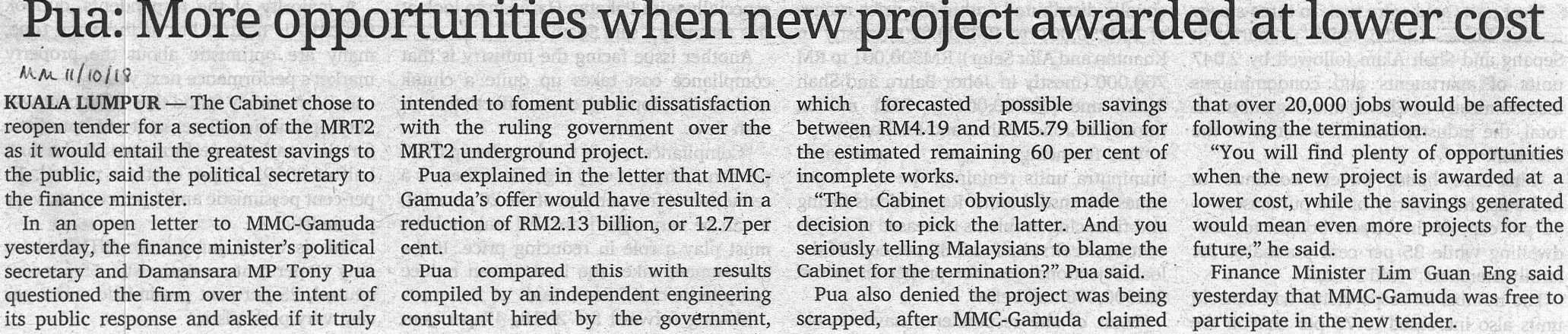 The Malay Mail - Pua : More Oportunities When New Project Awarded At Lower Cost |