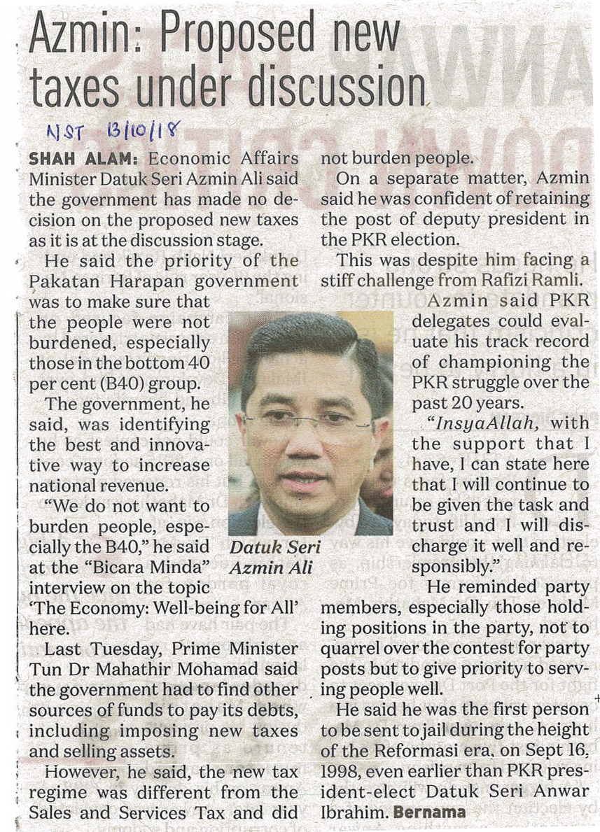 New Straits Times -Azmin: Proposed New Taxes Under Discussion |