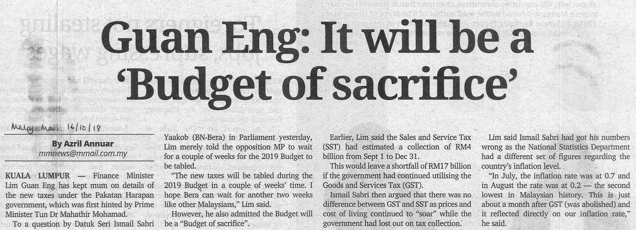 The Malay Mail - Guan Eng : It Will Be A 'Budget Of Sacrifice' |