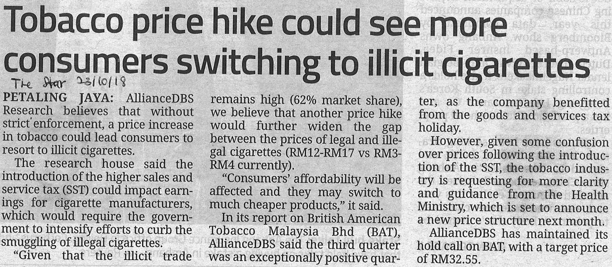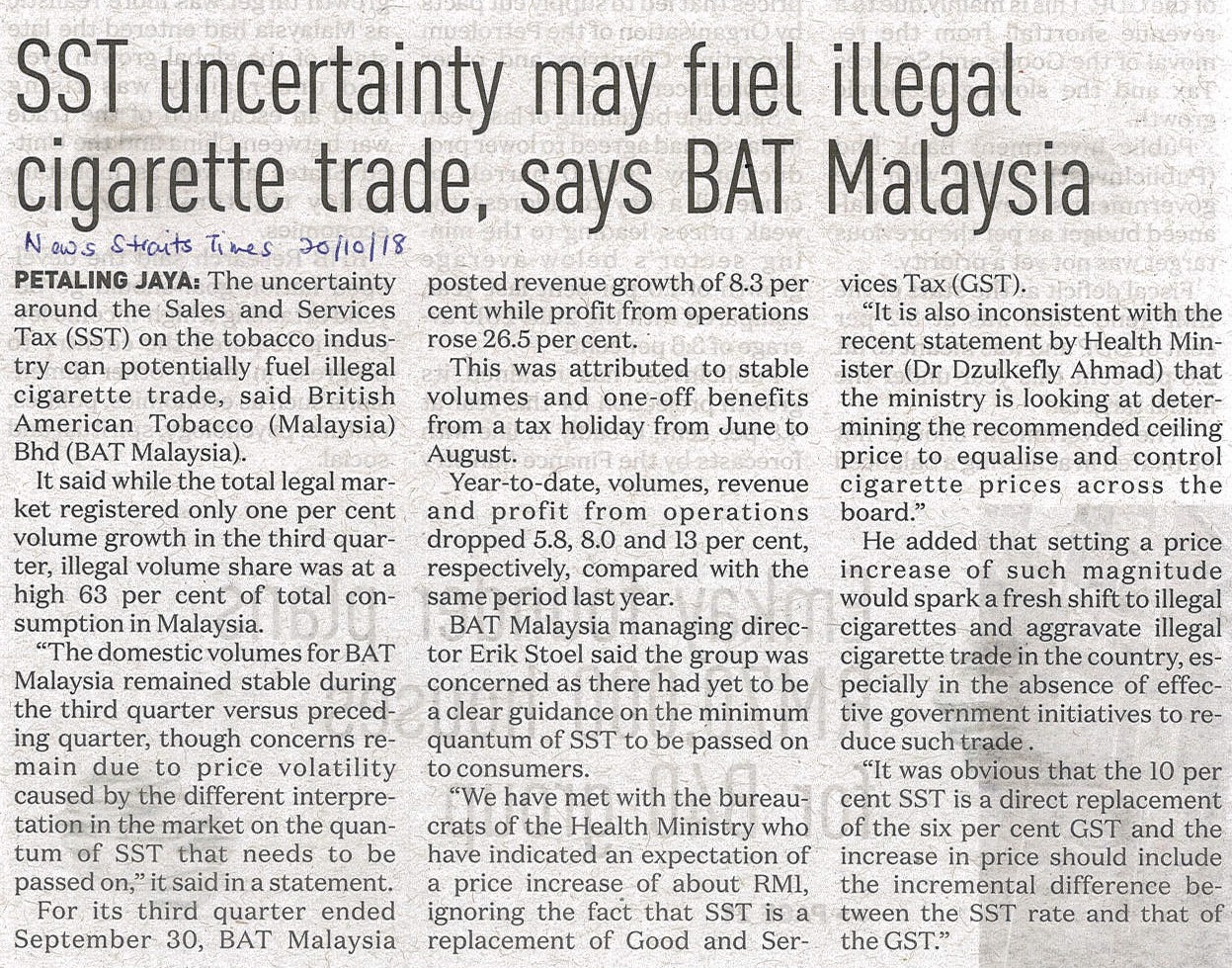 New Straits Times - SST Uncertainty May Fuel Illegal Cigarette Trade, Says BAT Malaysia |