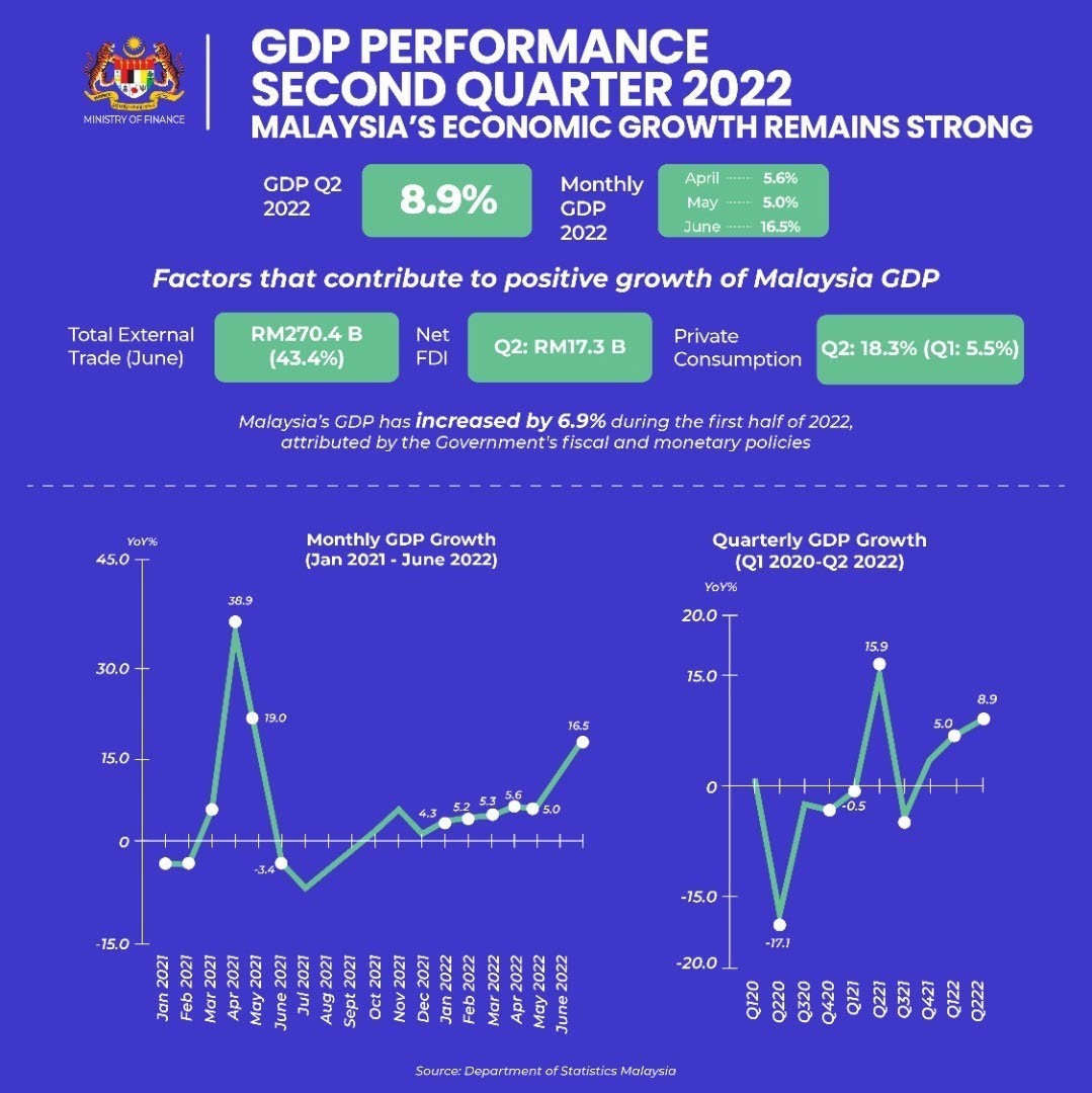 Malaysia's economy continued its recovery momentum, with its Gross Domestic Product (GDP) for the second quarter of 2022 (Q2 2022) growing by 8.9%, exceeding the 5.0% recorded in the first quarter of 2022 (Q1 2022) and outperforming the economic performance of several developed and regional countries (China: 0.4%, USA: 1.6%, EU: 4.0%, Korea: 2.9%, Singapore: 4.4%, Indonesia: 5.4%, Philippines: 7.4%). With the Q2 2022 growth achievement, GDP for the first half of 2022 is 6.9%, suggesting an equally strong third quarter growth. As such, the Government is confident the Malaysian economy can achieve the official 2022 GDP projection of 5.3% to 6.3%.