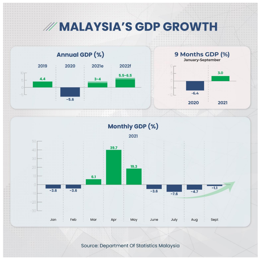 Malaysia's Gross Domestic Product (GDP) increased by 3.0% in the first nine months of 2021, compared to a 6.4% contraction in the same period last year. This is despite the fact that the GDP contracted by 4.5% year-on-year (YoY) in the third quarter of 2021 (Q3 2021), reflecting challenges caused by strict containment measures to stem the surge in new cases caused by more virulent COVID-19 variants of concern (VOCs).