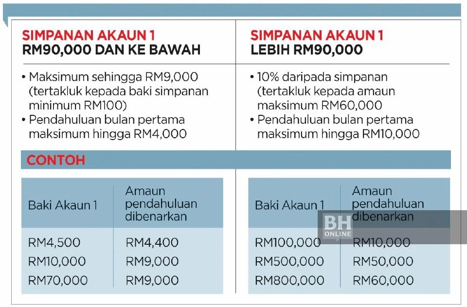 Ketua Pegawai Eksekutif KWSP, Tunku Alizakri Alias, berkata bagi ahli yang mempunyai simpanan dalam Akaun 1 bawah RM90,000, mereka mempunyai akses amaun pendahuluan sehingga RM9,000.