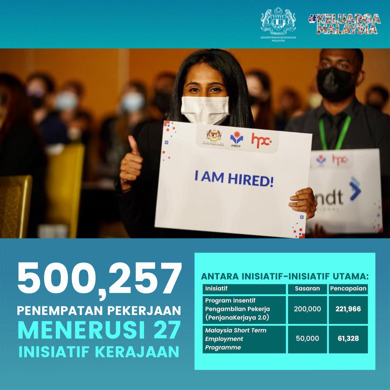 Antara inisiatif utama yang merealisasikan pencapaian tersebut adalah Program Insentif Pengambilan Pekerja (Penjana Kerjaya 2.0) yang telah berjaya menempatkan seramai 221,966 orang pekerja, dan MySTEP yang menempatkan seramai 61,328 orang pekerja secara kontrak di sektor awam dan Syarikat Berkaitan Kerajaan (GLC).