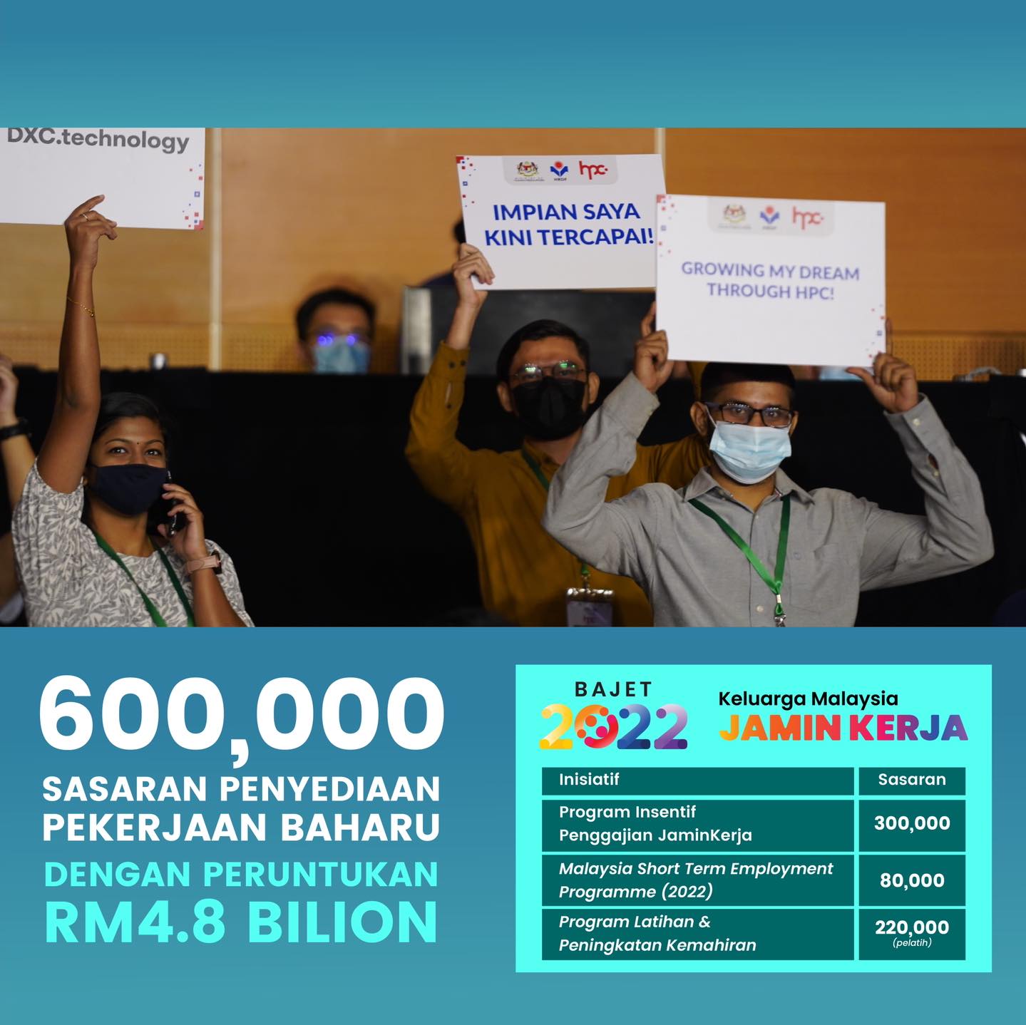 YB Senator Tengku Datuk Seri Utama Zafrul Tengku Abdul Aziz, Menteri Kewangan turut menyatakan bahawa bagi tahun 2022, Kerajaan menyasarkan penempatan 600,000 peluang pekerjaan di bawah inisiatif Jamin Kerja Keluarga Malaysia (JaminKerja) dengan peruntukan RM4.8 bilion di bawah #Bajet2022. Kerajaan yakin bahawa sasaran sebegini akan dapat dicapai dengan momentum kerja yang berterusan dan juga trend pemulihan ekonomi negara yang positif.