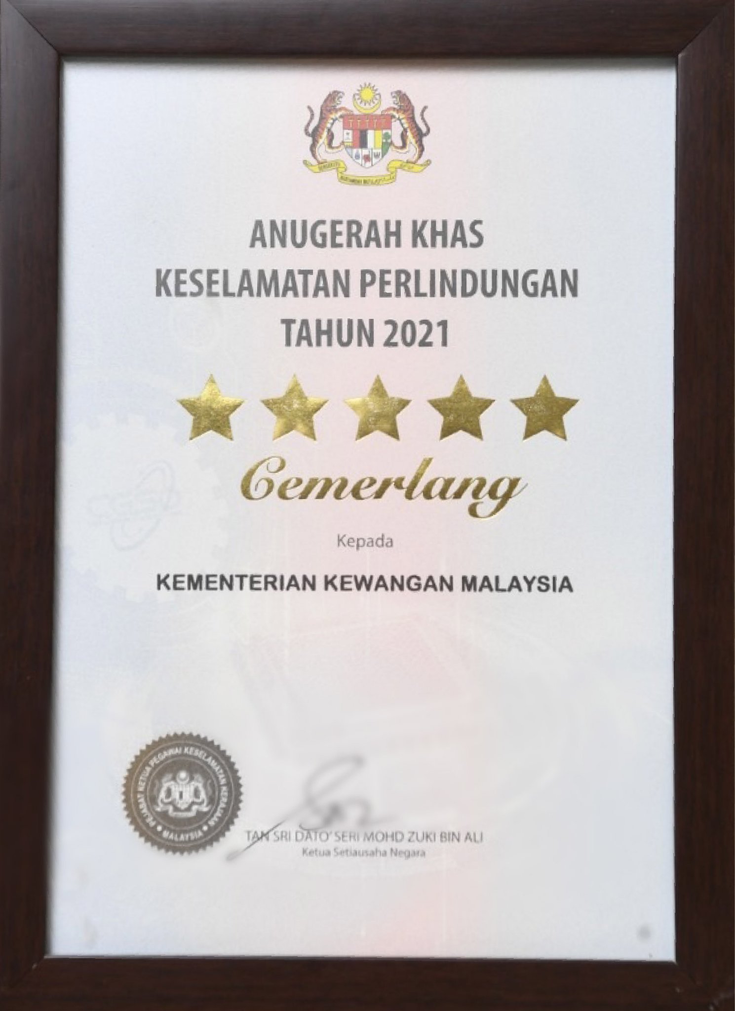 Tahniah Kementerian Kewangan (MOF) kerana menerima Anugerah Khas Keselamatan Perlindungan (IAKKP) daripada Pejabat Ketua Pegawai Keselamatan Kerajaan Malaysia. MOF menerima kategori CEMERLANG bagi keselamatan perlindungan.