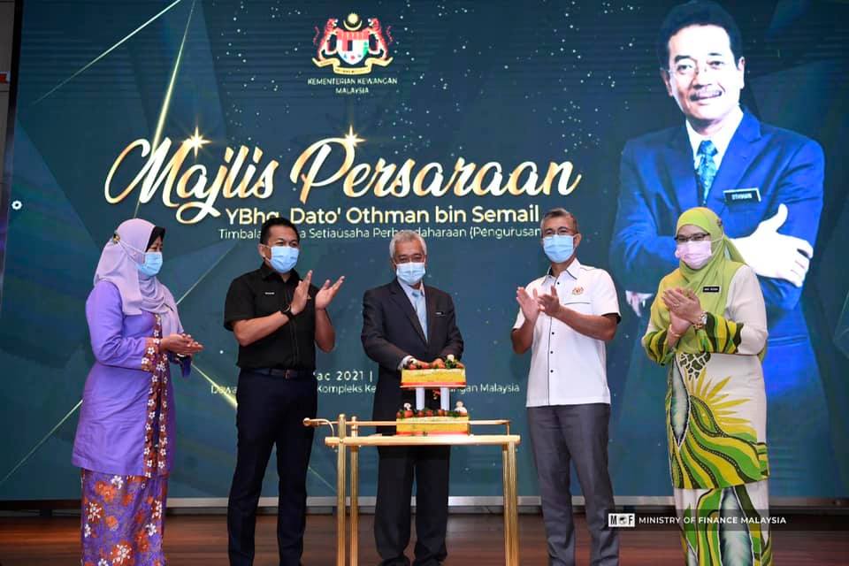 YB Senator Tengku Datuk Seri Utama Zafrul Tengku Abdul Aziz, Menteri Kewangan bersama YB Tuan Mohd Shahar Abdullah, Timbalan Menteri Kewangan II bersama pengurusan tertinggi dan warga Kementerian Kewangan Malaysia sektor pengurusan telah meraikan majlis persaraan YBhg. Dato’ Othman Semail, Timbalan Ketua Setiausaha (Pengurusan) yang telah berkhidmat selama hampir 39 tahun dan bersara wajib pada 19 Mac 2021.