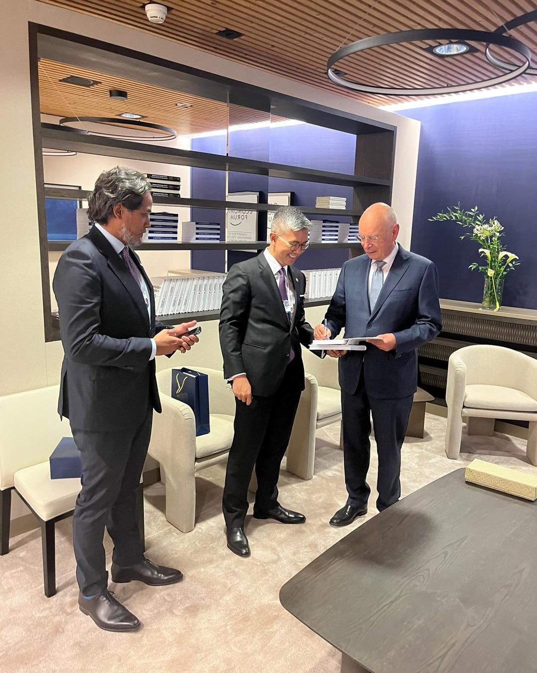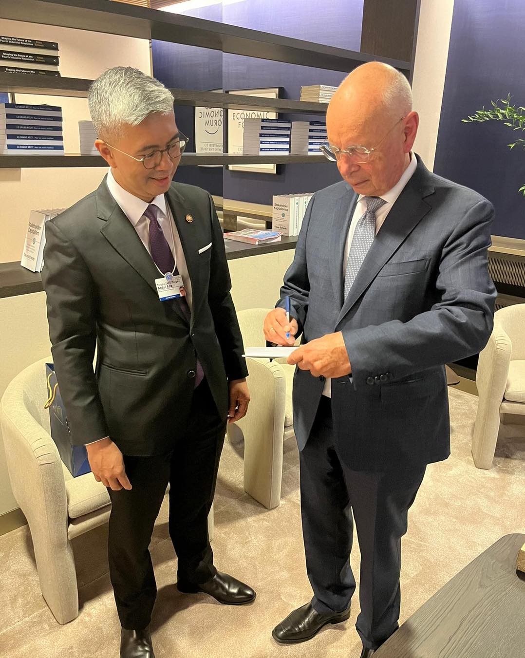 YB Senator Tengku Datuk Seri Utama Zafrul Tengku Abdul Aziz, Menteri Kewangan telah berkesempatan bersama-sama YB Tuan Khairy Jamaluddin Abu Bakar, Menteri Kesihatan untuk bertemu dengan Professor Klaus Schwab, pengasas dan pengerusi eksekutif World Economic Forum (WEF).