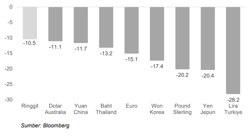 - Walaupun impak kadar faedah AS menyebabkan Ringgit menyusut sebanyak 10.5% dari awal tahun hingga kini, mata wang lain yang juga telah menyusut, dan pada kadar yang lebih tinggi. Ini membuktikan bahawa ini adalah satu fenomena global: