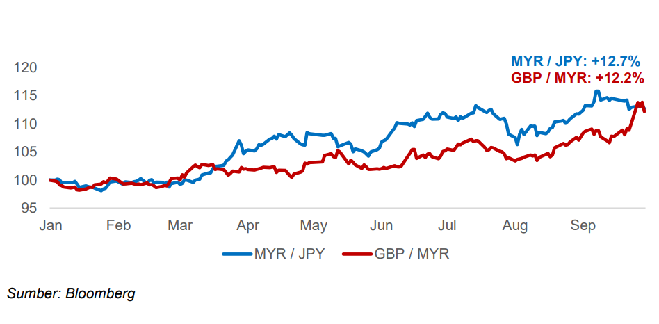 Pergerakan nilai matawang Ringgit berbanding Yen Jepun dan Pound Sterling UK (1 Jan hingga 29 Sept 2022)