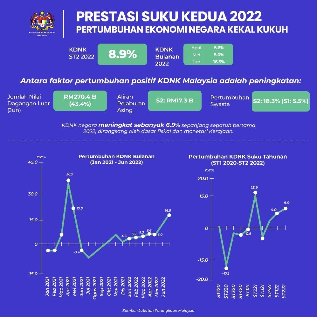 Ekonomi Malaysia meneruskan momentum pemulihan dengan Keluaran Dalam Negeri Kasar (KDNK) bagi suku kedua 2022 (S2 2022) mencapai pertumbuhan 8.9%, lebih kukuh berbanding 5.0% yang dicatat pada suku pertama 2022 (S1 2022) dan lebih kukuh berbanding prestasi ekonomi beberapa negara maju dan serantau (China: 0.4%, Amerika Syarikat: 1.6%, EU: 4.0%, Korea: 2.9%, Singapura: 4.4%, Indonesia: 5.4%, Filipina: 7.4%). Dengan pencapaian S2 2022 tersebut, pertumbuhan bagi separuh tahun pertama 2022 adalah 6.9% dan jangkaan suku ketiga (S3 2022) terus kukuh. Justeru, Kerajaan yakin ekonomi Malaysia mampu mencapai unjuran KDNK rasmi 2022, iaitu di antara 5.3% dan 6.3%.
