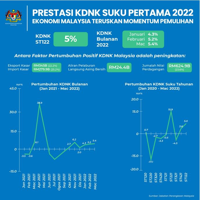 Ekonomi Malaysia berkembang sebanyak 5% pada suku pertama 2022 (S1 2022), disokong oleh peningkatan permintaan dalam dan luar negara serta pemulihan pasaran buruh. Perkembangan ini disumbang oleh sokongan dasar Kerajaan yang konsisten, terutamanya melalui inisiatif di bawah Bajet 2022 yang mengembang dengan langkah yang giat dilaksanakan sejak awal tahun. Selain itu, kesan limpahan daripada pelaksanaan langkah Bajet 2021 serta pakej-pakej rangsangan dan bantuan sebelum ini turut menyumbang kepada perkembangan tersebut.