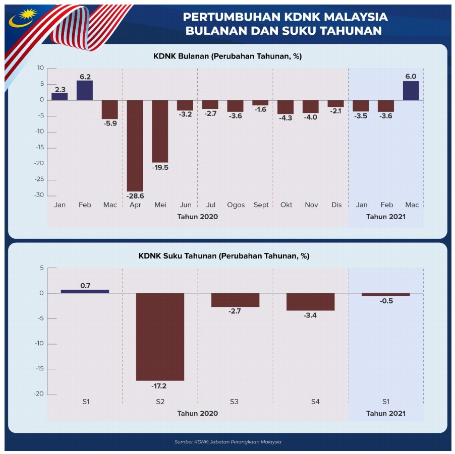 Bank Negara Malaysia (BNM) dan Jabatan Perangkaan Negara (DOSM) telah mengumumkan bahawa kadar pertumbuhan Keluaran Dalam Negera Kasar (KDNK) bagi suku pertama 2021 (S1 2021) ialah -0.5% dari tahun-ke-tahun, iaitu penguncupan yang jauh lebih kecil berbanding -3.4% pada suku keempat 2020 (S4 2020). Kadar ini mencerminkan prestasi ekonomi yang memberangsangkan dan menunjukkan bahawa negara terus menuju ke arah pemulihan, walaupun Perintah Kawalan Pergerakan 2.0 (PKP 2.0) dilaksanakan sepanjang tempoh tersebut.