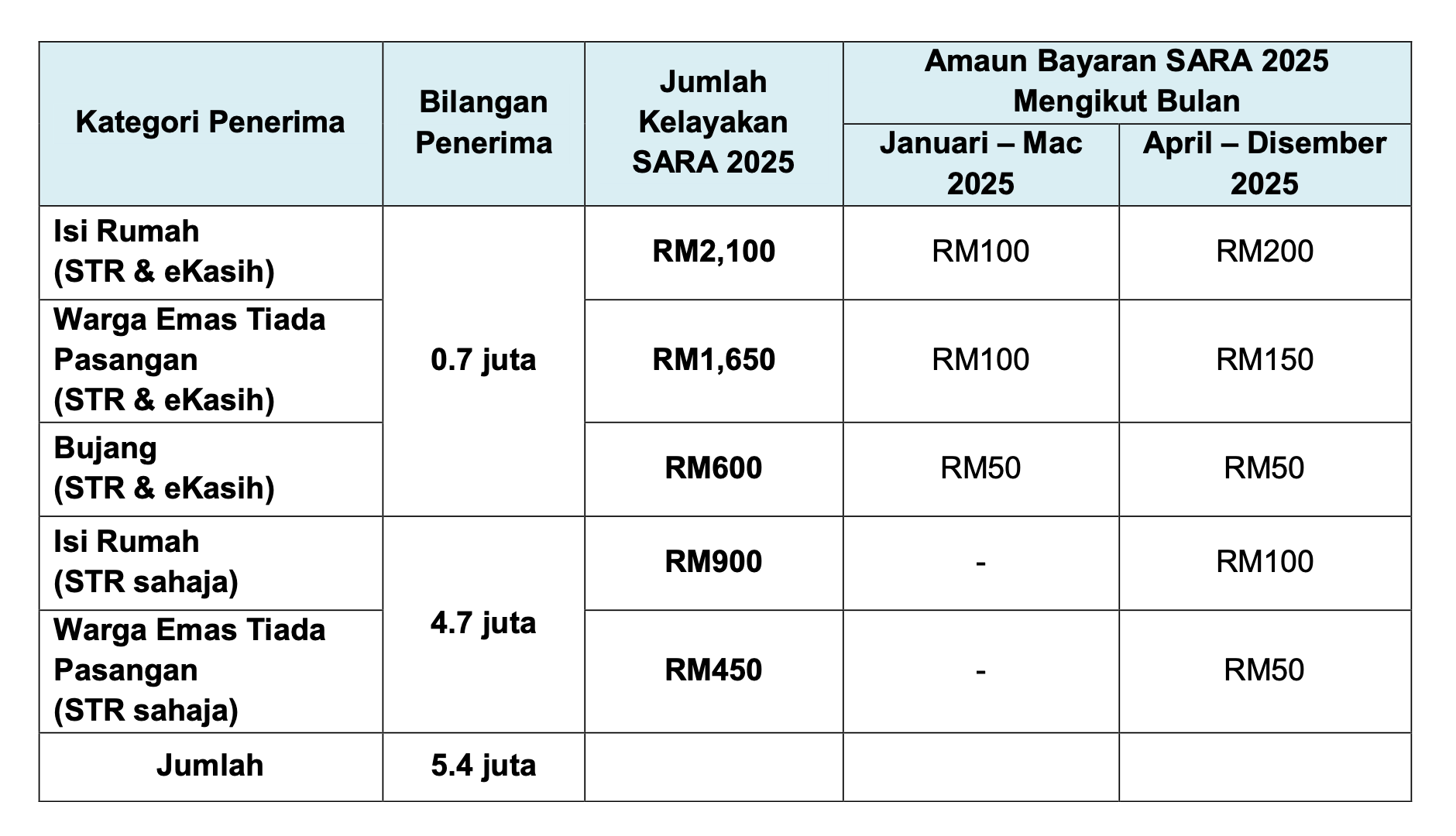 Kadar bantuan SARA ditingkatkan dengan isi rumah miskin dan miskin tegar di dalam rekod eKasih bakal menerima RM2,100 untuk tahun 2025, berbanding RM1,200 pada tahun 2024. Bantuan SARA sebanyak RM100 sebulan akan dikreditkan ke dalam MyKad penerima bagi bulan Januari hingga Mac 2025. Mulai April 2025, kadar bantuan ini akan ditingkatkan kepada RM200 sebulan.